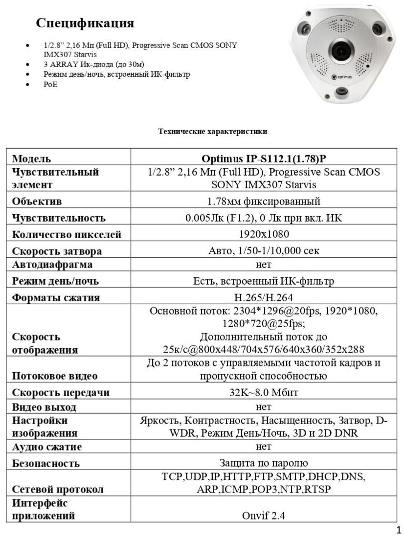 IP-видеокамера IP-S112.1(1.78)P создана на основе 1/2.8” 2,16 Мп (Full HD) Progressive Scan CMOS SONY IMX307 Starvis.