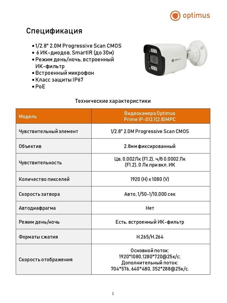Видеокамера Optimus Prime IP-012.1(2.8)MPC