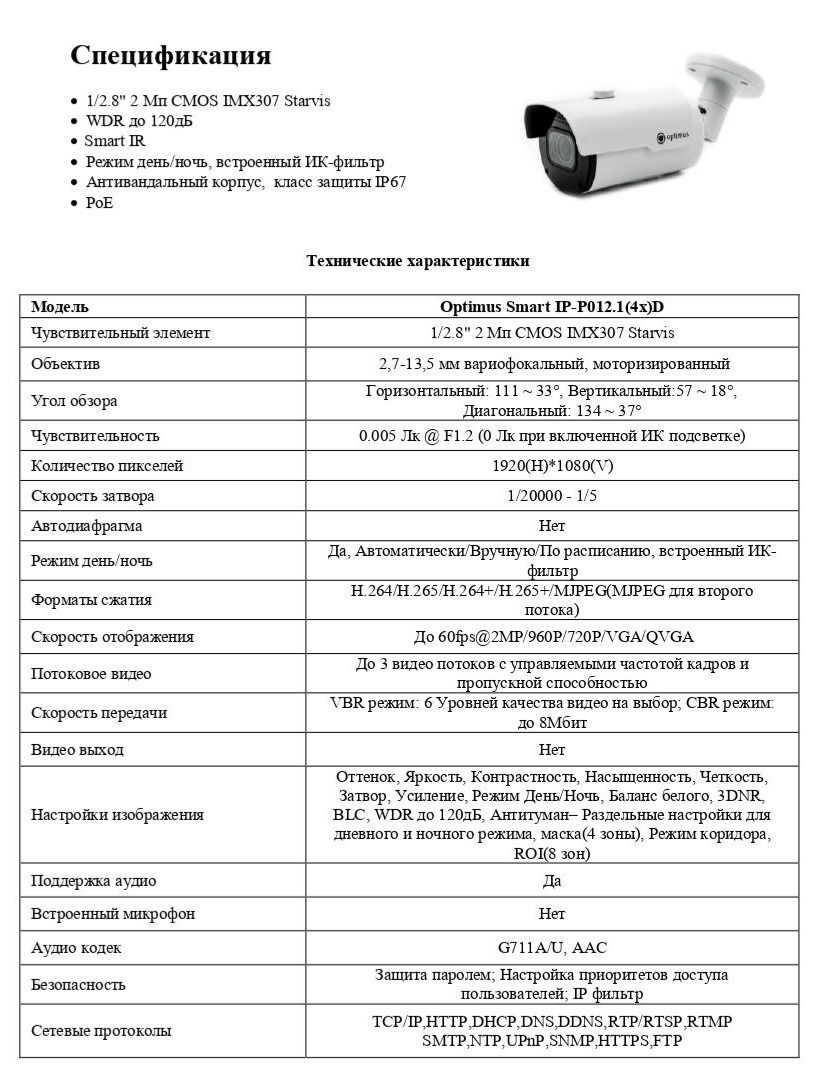 IP-видеокамера Smart IP-P012.1(4x)D создана на основе 1/2.8" матрицы CMOS IMX307 Starvis, разрешением 2 Мп 1920(H)*1080(V) Оборудована вариофокальным, моторизированным 2,7-13,5 мм объективом, встроенным ИК-фильтром.