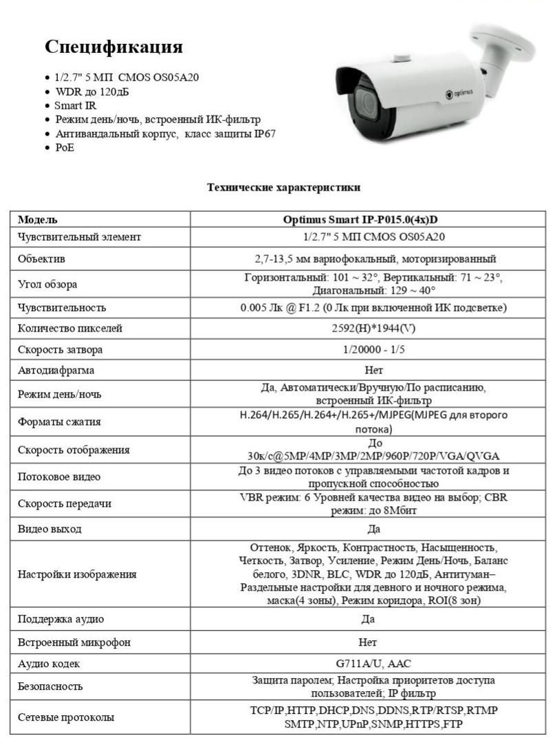 IP-видеокамера Smart IP-P015.0(4x)D создана на основе 1/2.7" матрицы CMOS OS05A20, разрешением 5 Мп 2592(H)*1944(V) Оборудована вариофокальным, моторизированным 2,7-13,5 мм объективом, встроенным ИК-фильтром.