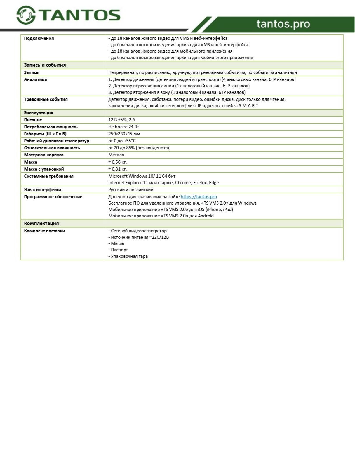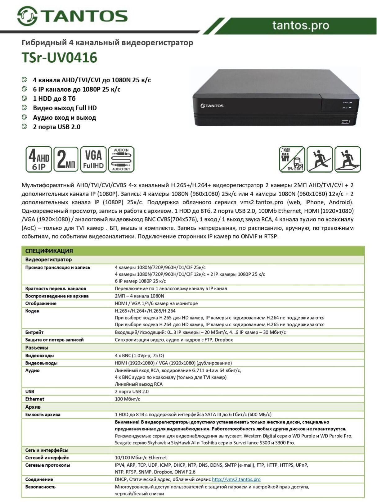 Мультиформатный AHD/TVI/CVI/CVBS 4-х канальный H.265+/H.264+ видеорегистратор 2 камеры 2МП AHD/TVI/CVI + 2 дополнительных канала IP (1080Р). Запись: 4 камеры 1080N (960х1080) 25к/с или 4 камеры 1080N (960х1080) 12к/с + 2 дополнительных канала IP (1080Р) 25к/с. Поддержка облачного сервиса tantos (web, iPhone, Android). Одновременный просмотр, запись и работа с архивом. HDD до 8Тб. 2 порта USB 2.0, 100Mb Ethernet, HDMI (1920×1080) /VGA (1920×1080)/ аналоговый видеовыход BNC CVBS(704x576), 1 вход / 1 выход звука RCA,4 канала аудио по коаксиалу (AoC) – только для TVI камер. БП, мышь в комплекте. Запись непрерывная, по расписанию, вручную, по тревожным событиям, по событиям видеоаналитики. Подключение сторонних IP камер по ONVIF и RTSP.