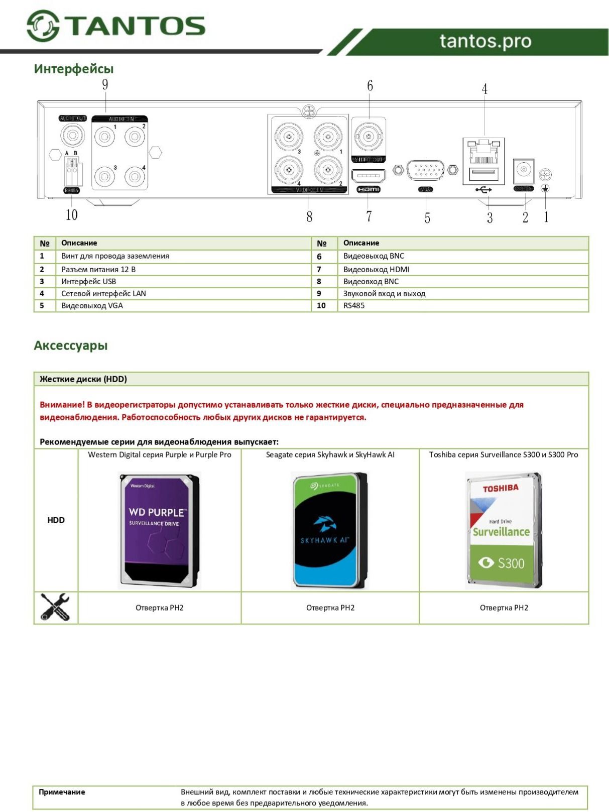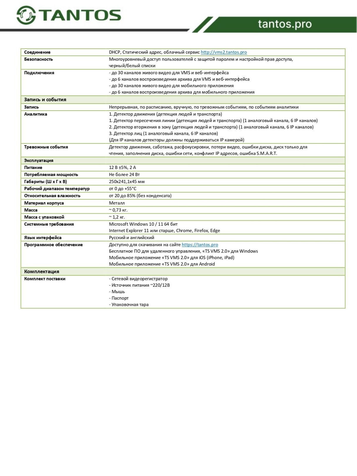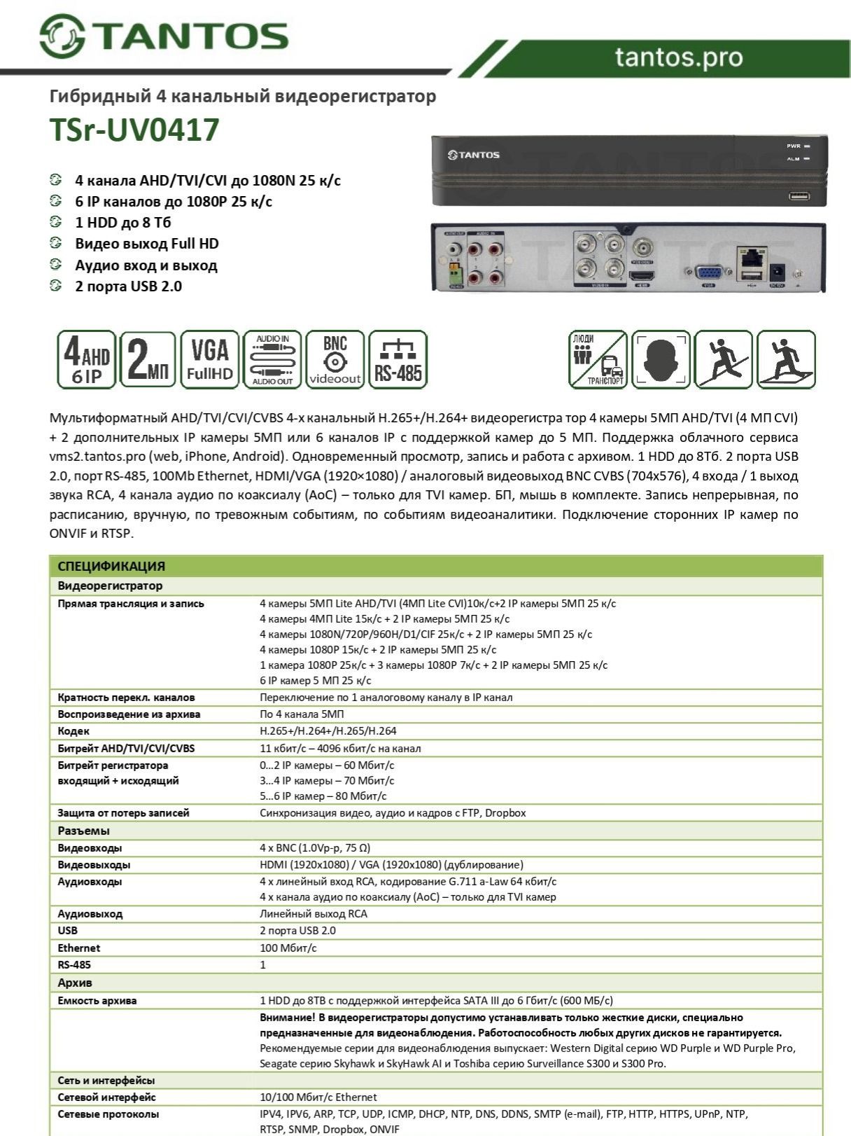 Мультиформатный AHD/TVI/CVI/CVBS 4-х канальный H.265+/H.264+ видеорегистратор 4 камеры 5МП AHD/TVI (4 МП CVI) + 2 дополнительных IP камеры 5МП или 6 каналов IP с поддержкой камер до 5 МП. Поддержка облачного сервиса tantos (web, iPhone, Android). Одновременный просмотр, запись и работа с архивом. HDD до 8Тб. 2 порта USB 2.0, порт RS-485, 100Mb Ethernet, HDMI/VGA (1920×1080) / аналоговый видеовыход BNC CVBS (704x576), 4 входа / 1 выход звука RCA, 4 канала аудио по коаксиалу (AoC) – только для TVI камер. БП, мышь в комплекте. Запись непрерывная, по расписанию, вручную, по тревожным событиям, по событиям видеоаналитики. Подключение сторонних IP камер по ONVIF и RTSP.
