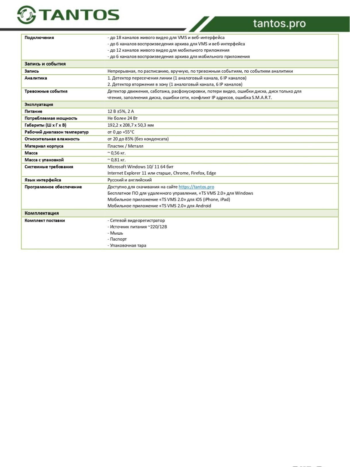 Мультиформатный AHD/TVI/CVI 4-х канальный H.265+ / H.264+ видеорегистратор + 2 дополнительных канала IP (1080Р). Запись: 4 камеры 1080N (960х1080)/ 720P (1280х720) 25к/с или 4 камеры 1080N (960х1080)/ 720P (1280х720) 15к/с + 2 IP камеры 1080P 25 к/с или 6 IP камер 1080P 25 к/с. Поддержка облачного сервиса tantos Одновременный просмотр, запись и работа с архивом. HDD до 6Тб. 2 порта USB 2.0, 100Mb Ethernet, HDMI (1920×1080) /VGA (1920×1080), 1 вход / 1 выход звука RCA, 4 канала аудио по коаксиалу (AoC) – только для TVI камер. БП, мышь в комплекте. Синхронизация с FTP, Dropbox. Запись непрерывная, по расписанию, вручную, по тревожным событиям, по событиям видеоаналитики. Подключение сторонних IP камер по ONVIF и RTSP.