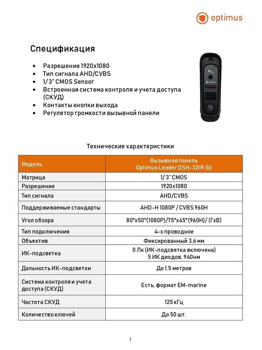 В вызывной панели Optimus Leader DSH-32IR (b) встроена 1/ 3” CMOS цветная матрица с разрешением 1080Р, которая гарантирует Вам изображение отличного качества. Панель оснащена ИК-подсветкой. Угол обзора камеры до 80°, Тип сигнала AHD/CVBS. Панель адаптирована регулятором громкости для удобства использования.