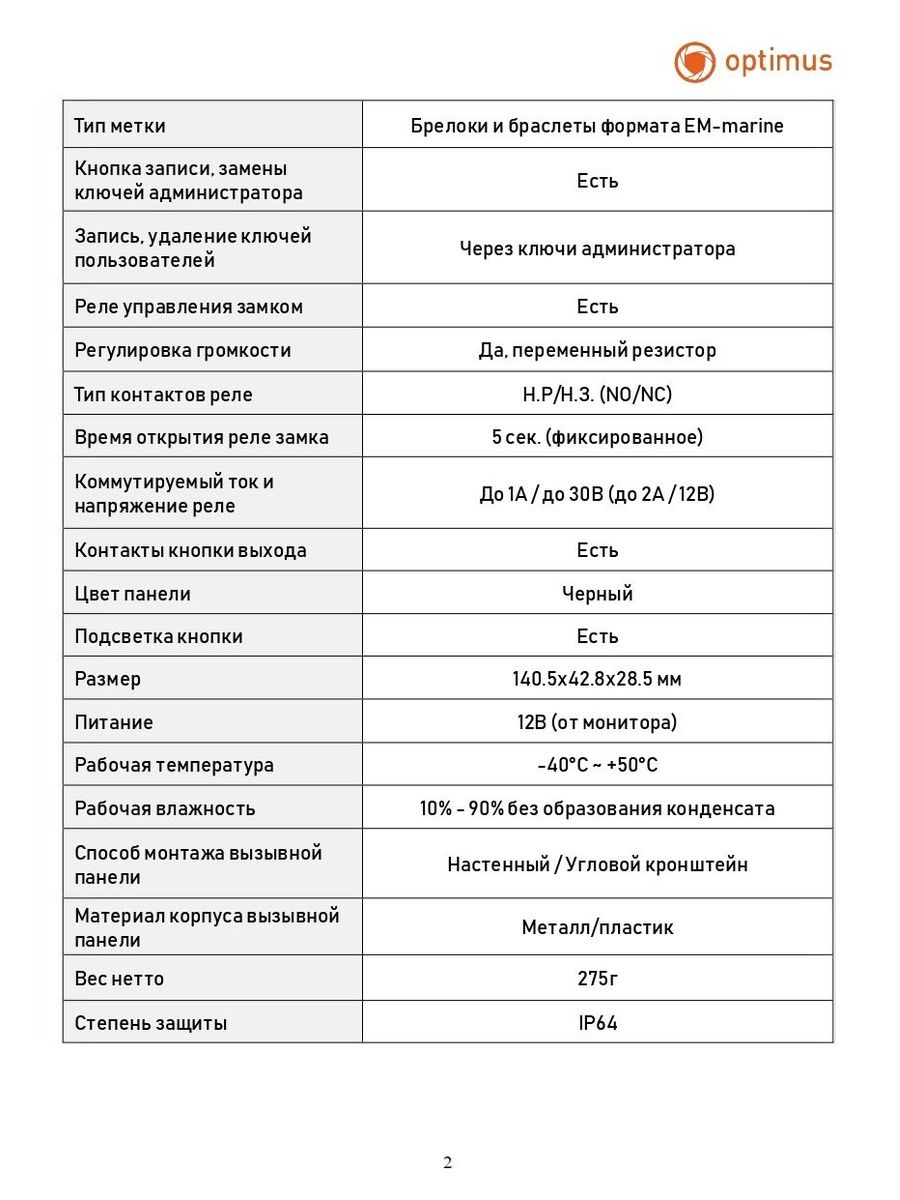 Комплектация Вызывная панель с кабелем (23см) – 1шт. Монтажный комплект – 1шт. Комплект проводов для подключения - 1шт. Козырек для панели – 1шт. Уплотнительная прокладка для настенного монтажа вызывной панели – 1шт. Ключ/брелок – 7шт (5 ключей пользователей / 2 ключа администратора) Угловой кронштейн для вызывной панели – 1шт. Коробка-1шт.