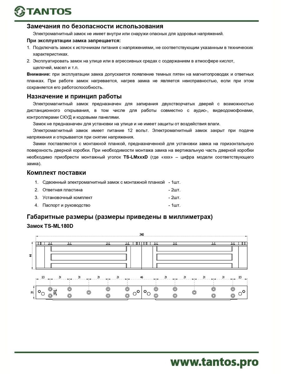 Электромагнитный замок TS-ML180D с силой удержания на отрыв до 180 кг, предназначен для установки на легкие и средние двухстворчатые двери с возможностью дистанционного открывания. Совместим с контроллерами СКУД, кодонаборными панелями, домофонами, вызывными панелями и т.п.