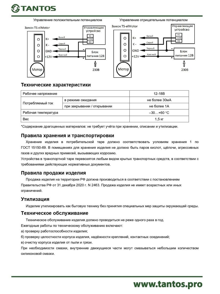 - Потребляемый ток: в режиме ожидания не более 30мА \ при закрывании / открывании не более 1А
