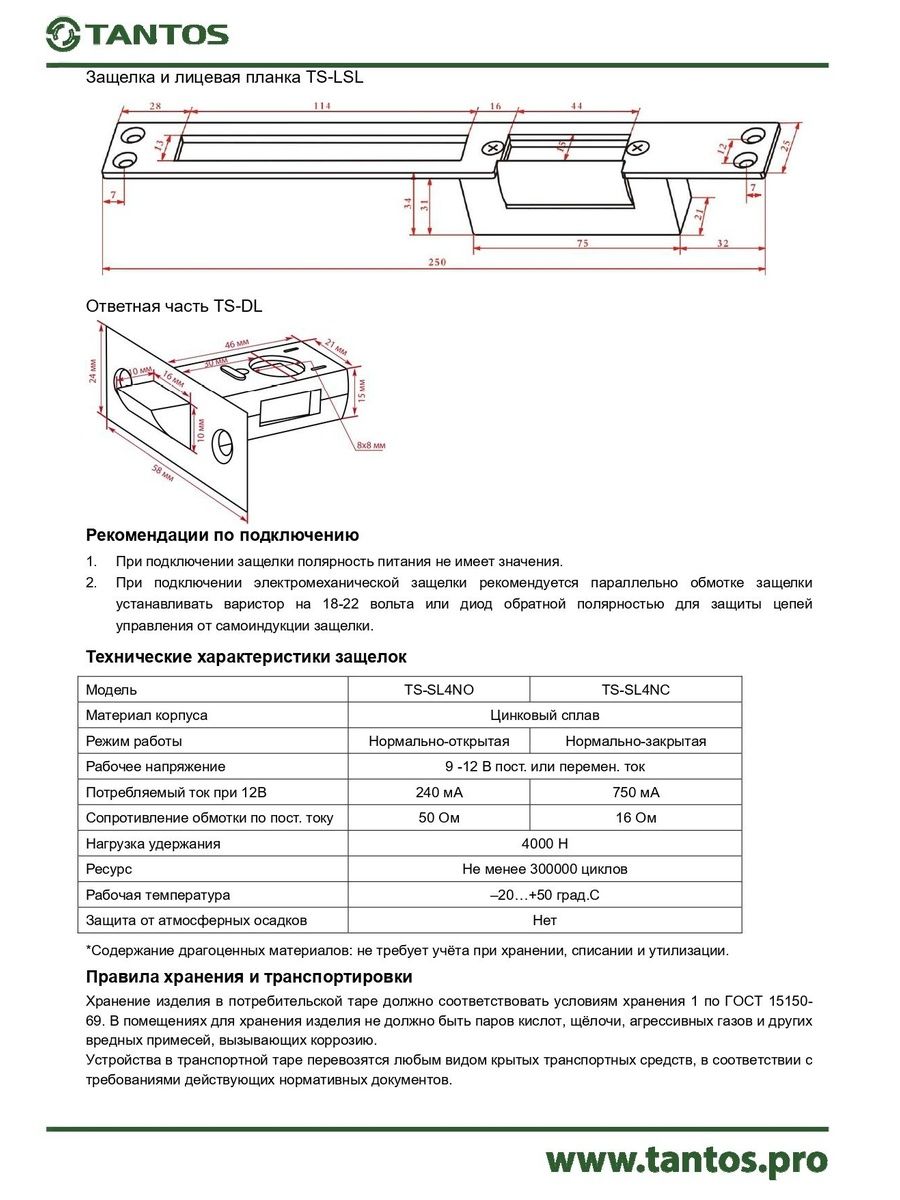 Защелка TS-SL4NO является нормально-открытой и блокируется при подаче питания. Время подачи питания не регламентируется.